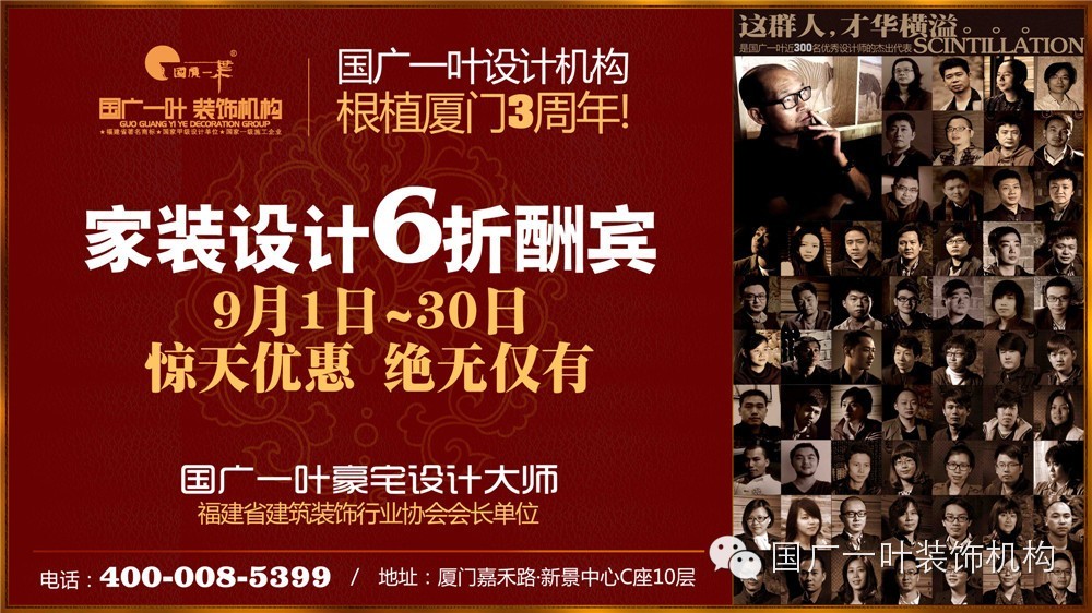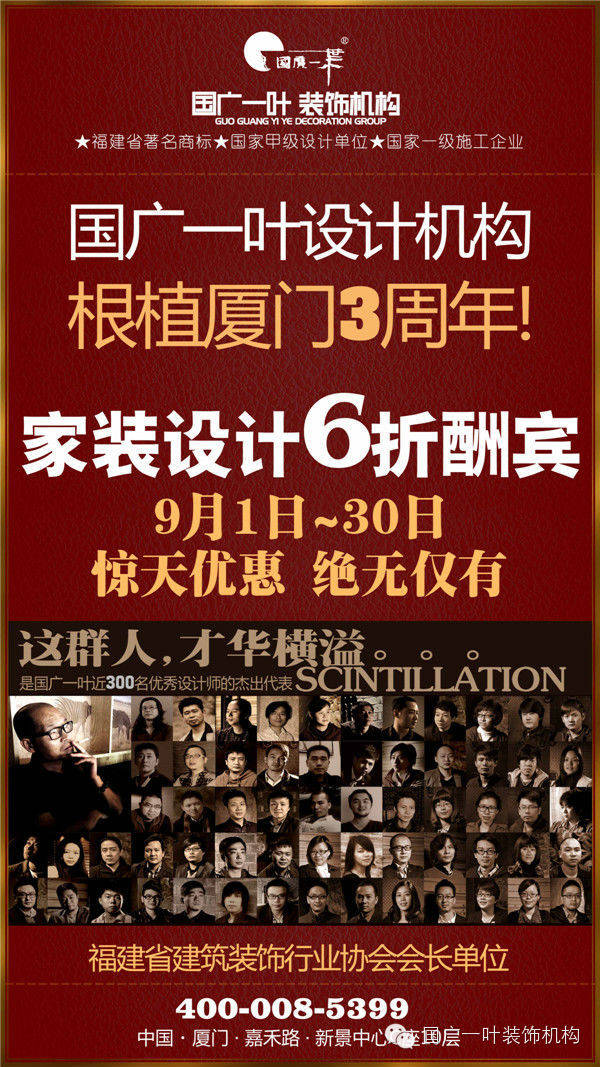 【资讯】2014年9月1日,国广一叶设计机构根植厦门3周年。3年前,厦门国广一叶设计机构在厦门市嘉禾路新景中心C座10层盛大开业;3年来,厦门国广一叶深受厦门、泉州等地广大客户的支持并迅速发展壮大,现已发展成一个拥有5个公装设计所,5个家装设计所,设计师近80人,专注纯高端设计的室内设计公司。